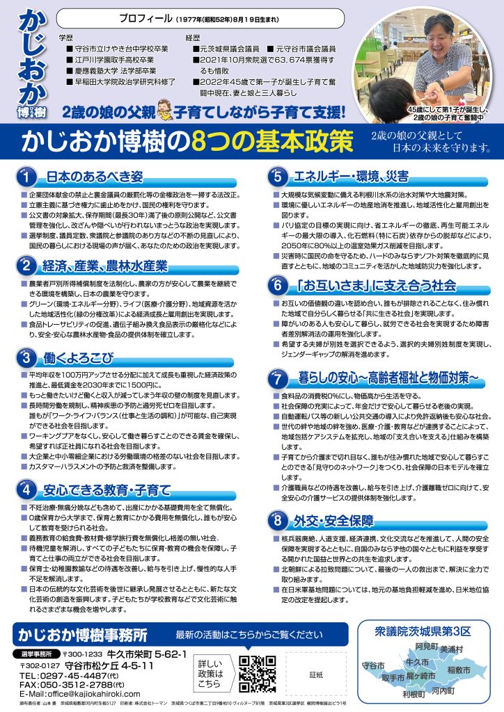 私の娘もおかげさまで先日2歳の誕生日を迎えました。全ての子供たちが、日本のどこで生まれ育っても、夢と希望に向かって努力することができる格差の無い社会を創ります。そして、若者が安心して様々なことにチャレンジできる活力こそが日本の強い経済を生み出し、年金だけでも安心して暮らせる高齢者福祉を実現させます。みんなでもう一度、世界が羨む強い経済の安全安心な日本を取り戻しましょう!全ての子供たちが、日本に生まれて本当によかったと言ってもらえるような政治をかじおか博樹は実現します!